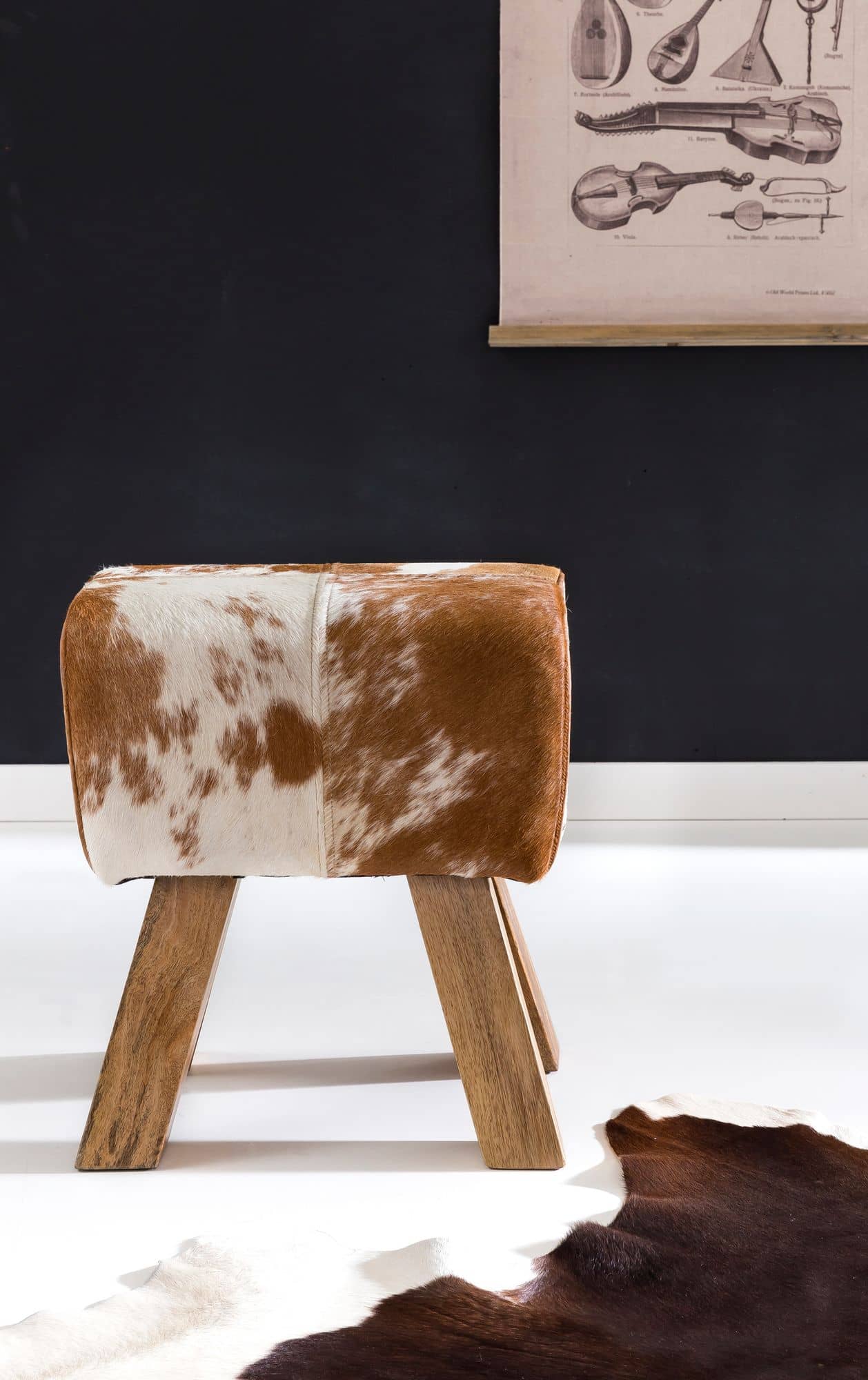 Landhaus-Chic: Gemütlicher Sitzhocker aus Haarleder und Mango-Holz – Exklusives Design von Myhomelando